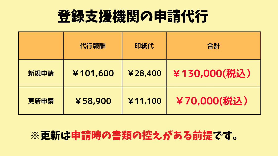登録支援機関の代行報酬:新規登録(約10万)・更新申請(約6万)