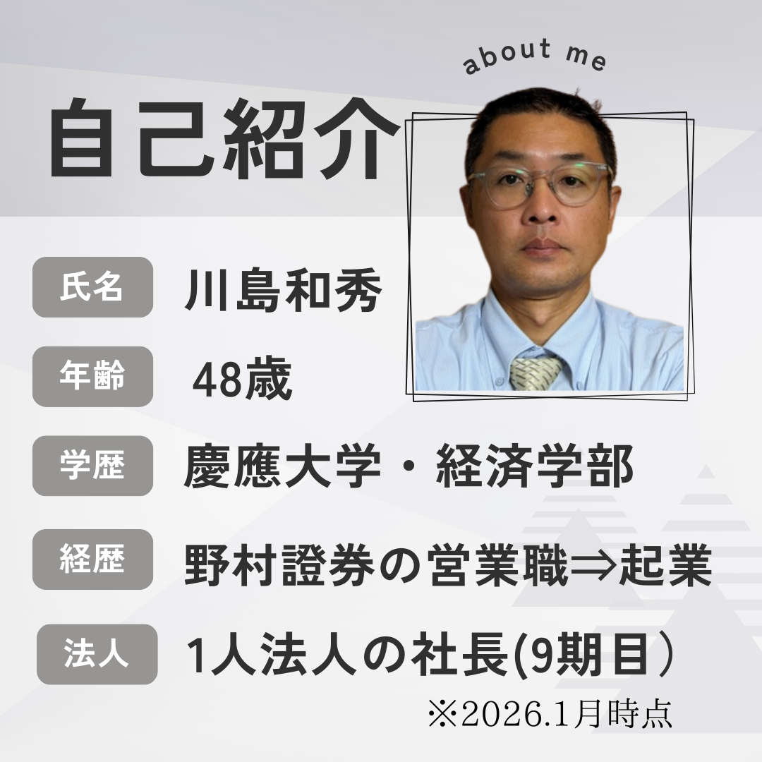 事務所は慶応大学卒、野村證券で17年間営業していた代表・川島のみの1人行政書士事務所です。(※行政書士事務所以外に1人法人を経営しています。)