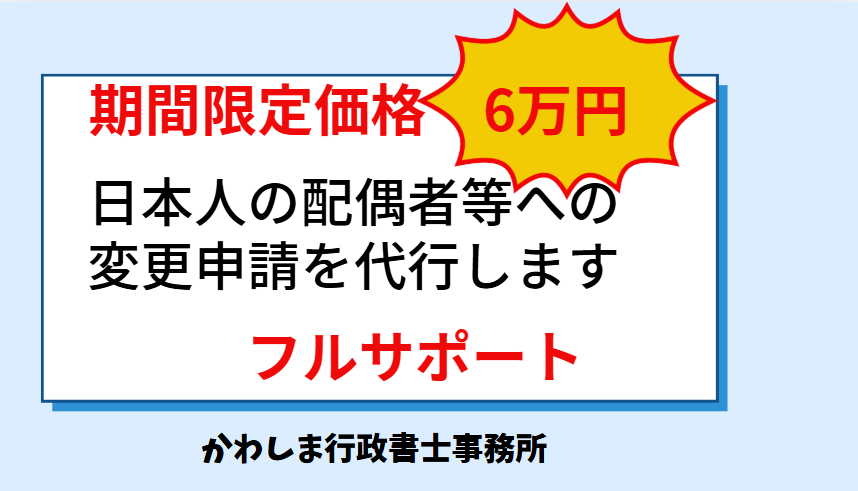 群馬県内の日本人の配偶者等への変更申請(期間限定):¥60,000(税込)