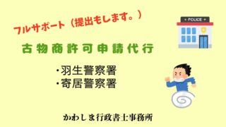古物商許可申請の代行の対応エリアは、栃木県の(足利、佐野)警察署が管轄のエリアでやらせていただいています。古物商許可申請は代表である私が担当いたします。代表・川島(かわしま)のプロフィールはこちら当事務所ではトラブル防止のため(依頼内容を正...